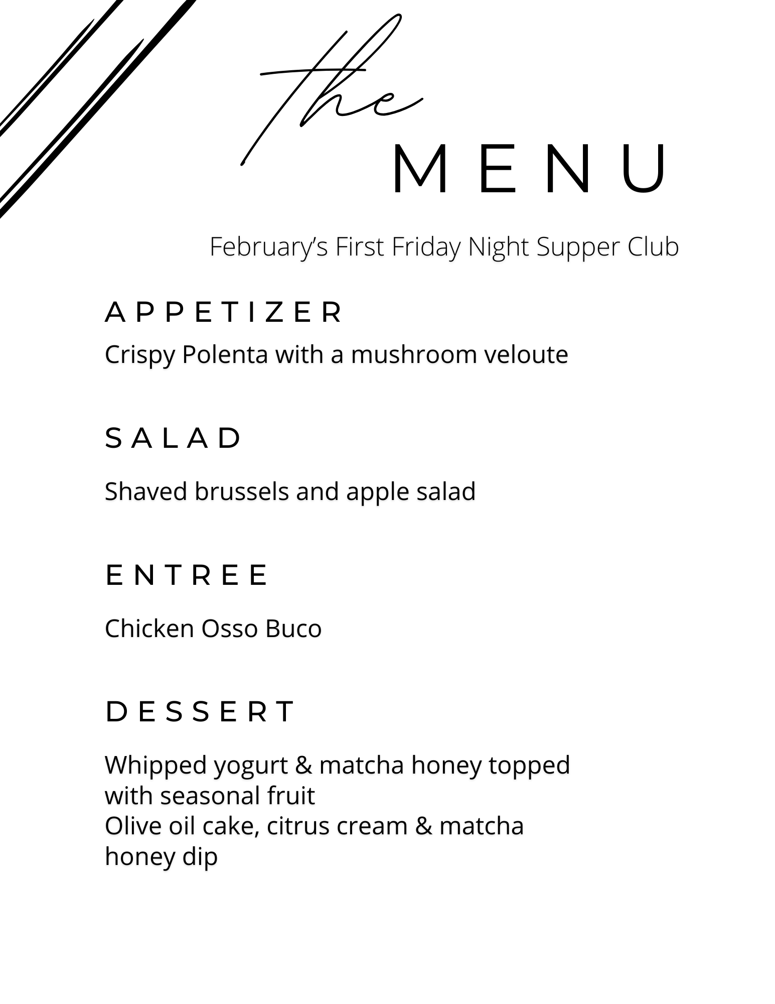 The first Friday of every month our head chef, Marco, will be preparing a coursed out meal, complete with complimentary cocktails, just as tradition has inspired.